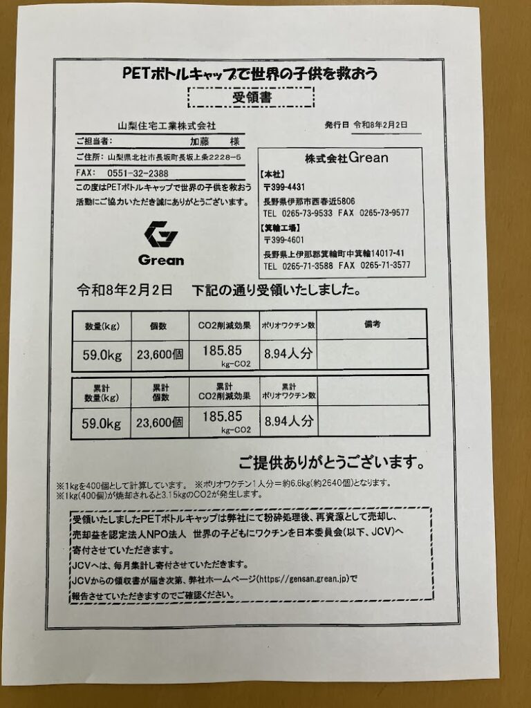 このたび、株式会社GREAN様を通じて再資源化によって得られた売却益を、「認定NPO法人 世界の子どもにワクチンを 日本委員会(JCV)」へ寄付いたしました。
